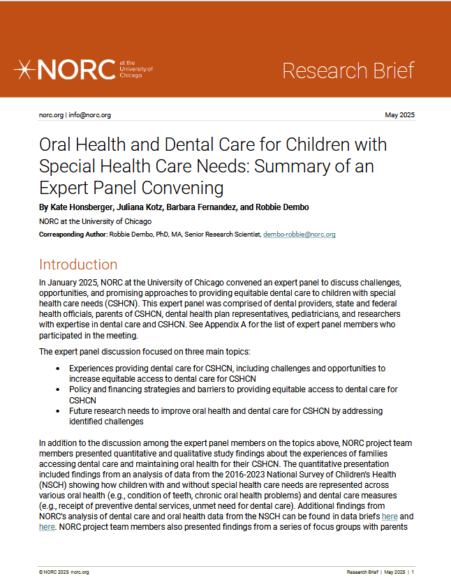 NORC at the University of Chicago conducted a comprehensive, national study to better understand the oral health needs and dental care experiences of CSHCN, including children with complex medical conditions, and compared these experiences to those of children without special health care needs. NORC’s mixed methods approach included convening a virtual panel of experts to solicit insights, discuss challenges, and identify potential policy solutions. The expert panel included child health and dental care researchers, clinicians, policy and public health officials, advocates, and parents of children with special health care needs. The brief outlines key takeaways on the topics of accessibility and accommodations, provider education and training, dental insurance coverage policies, oral health care at home, innovative models and approaches, and future research needs.