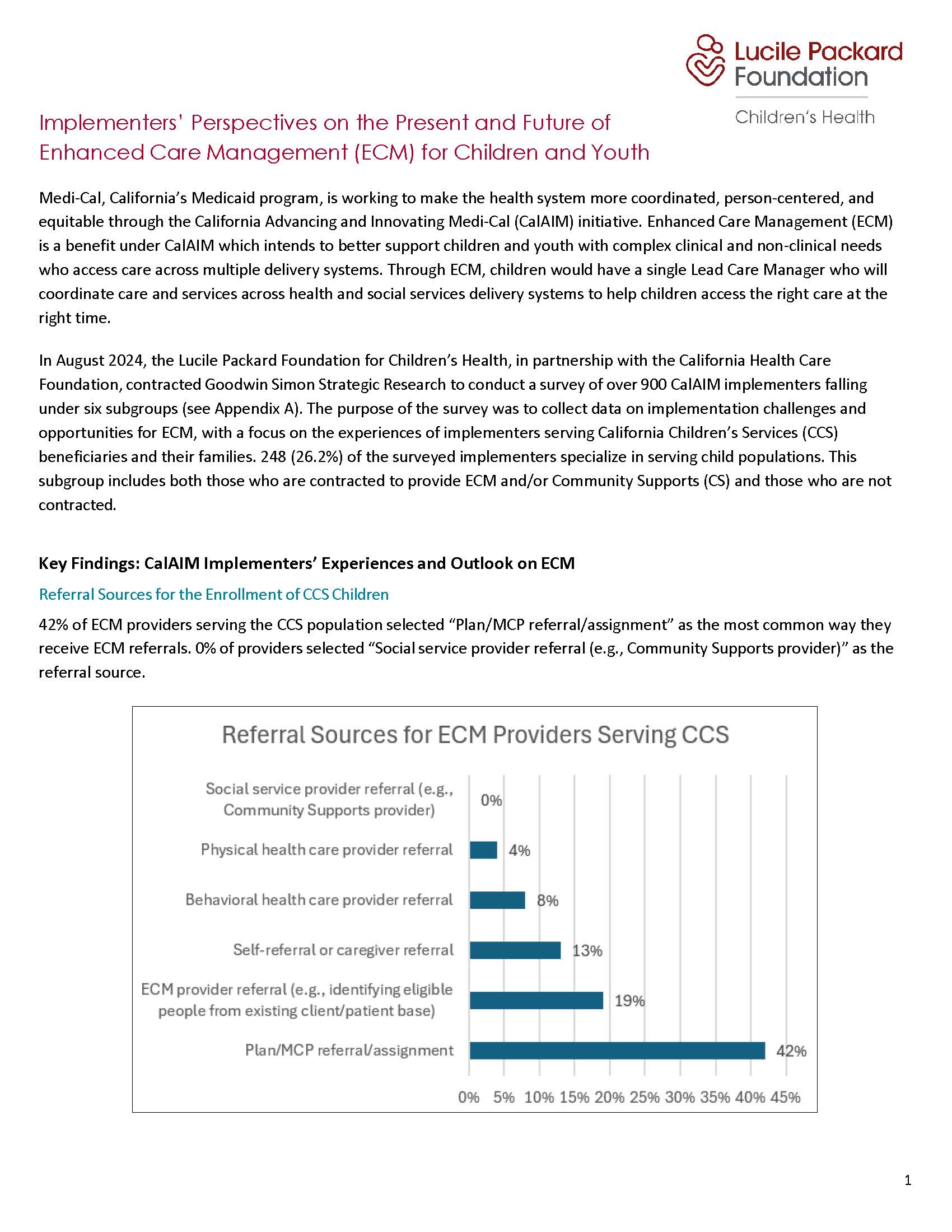 In August 2024, the Lucile Packard Foundation for Children’s Health, in partnership with the California Health Care Foundation, contracted Goodwin Simon Strategic Research to conduct a survey of over 900 CalAIM implementers to collect data on implementation challenges and opportunities for ECM, with a focus on the experiences of implementers serving the California Children’s Services population of focus. This issue brief, produced by our Foundation, highlights key survey findings reflecting CalAIM implementers’ experiences and outlook on ECM and shares recommendations for improving ECM for providers, children, and families.