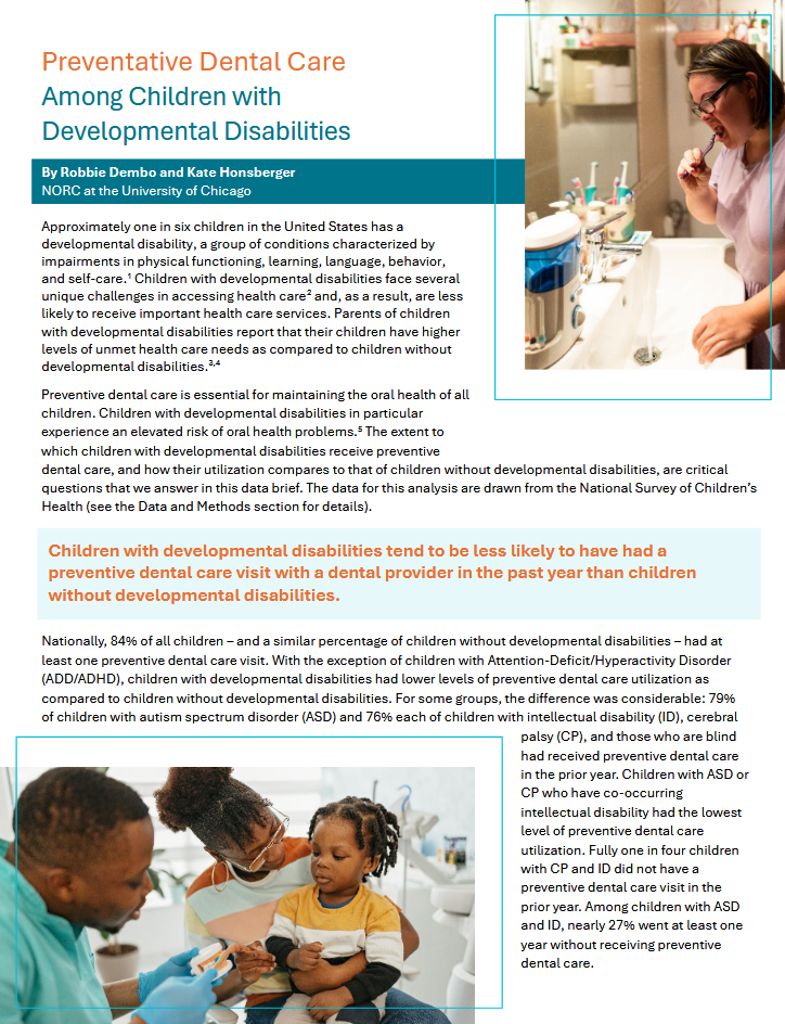 NORC at the University of Chicago conducted a comprehensive, national study to better understand the oral health needs and dental care experiences of CSHCN and compared these experiences to those of children without special health care needs. NORC’s mixed methods approach included conducting a quantitative analysis of oral health status and dental care use and access among these populations using data from the National Survey of Children’s Health. This fact sheet spotlights the unique experiences of one key subgroup of CSHCN, children with intellectual and developmental disabilities.
