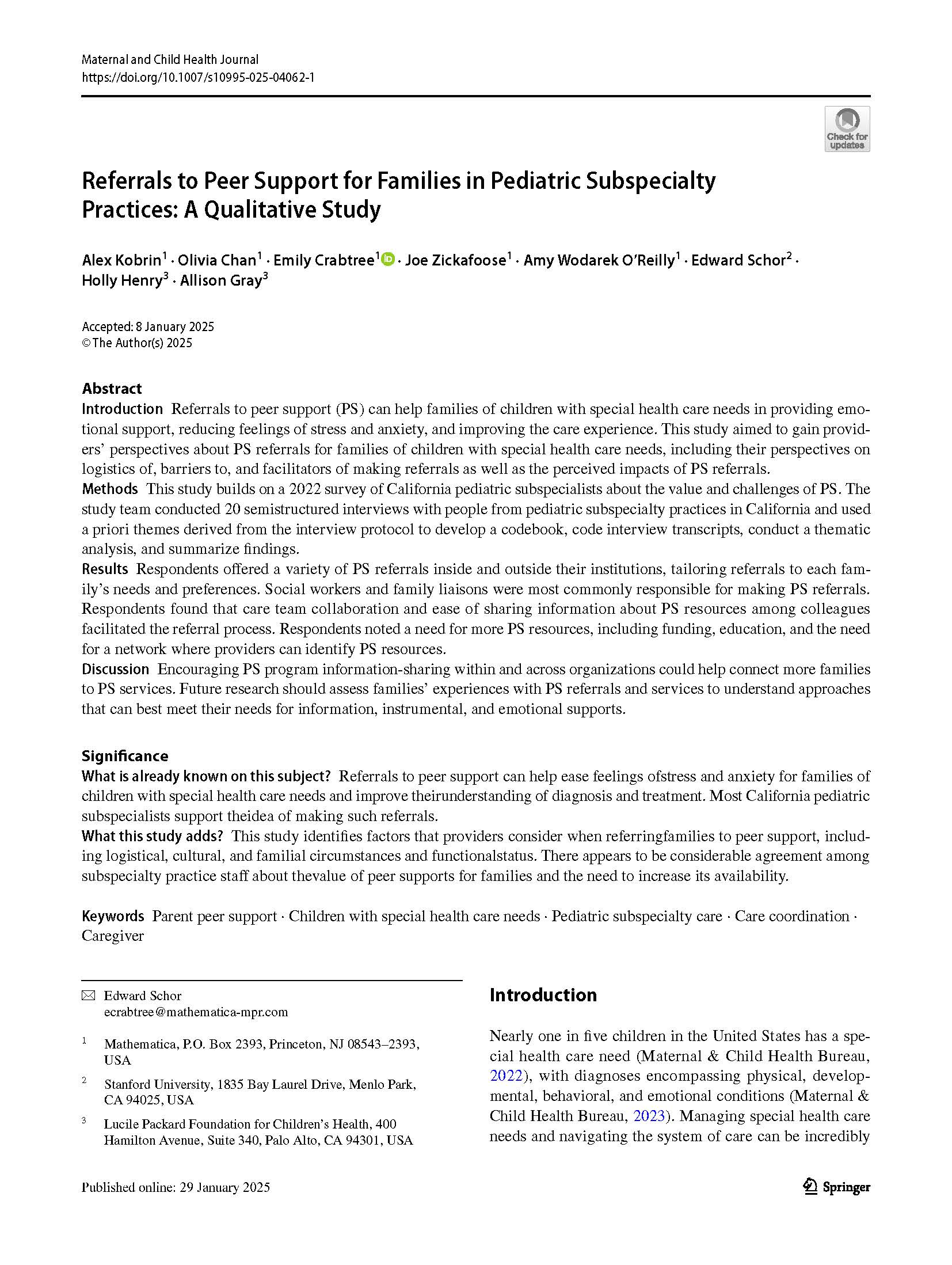 A 2022 survey of California pediatric subspecialists examined opinions on and referral practices for PS. Building off this survey, Mathematica conducted interviews of staff at pediatric subspecialty practices across California to understand how referrals for PS occur, and identified factors that may facilitate or impede the referral process.