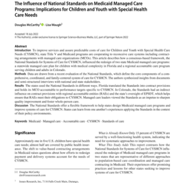 A robust evaluation of the uptake and influence of the National Standards for Systems of Care for CYSHCN was conducted. This evaluation included interviews with more than 50 stakeholders and case studies on the use of the National Standards in five states. Many stakeholders stated that they see the National Standards as a foundational tool that informs their current and future work in research, policy, and practice. A journal article describing the use of the National Standards in redesigning Medicaid managed care programs in two states also was developed.