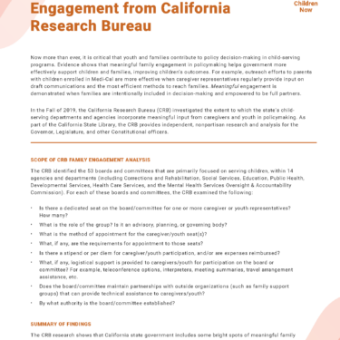 State policy decisions about children’s health and well-being are made far too often without drawing on the experience and expertise of parents, caregivers, and youth themselves. This project is a continuation of a past Foundation grant to Children Now under which the California Research Bureau collected data on family engagement policies within state agencies serving children. The goal of this grant is to produce an official, government-sanctioned baseline report on all opportunities for families to engage in state policymaking conversations. Advocacy organizations will be encouraged to use the report to urge policymakers to create additional family engagement roles, and to recruit partners to press for these opportunities.