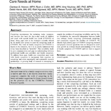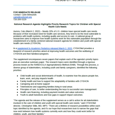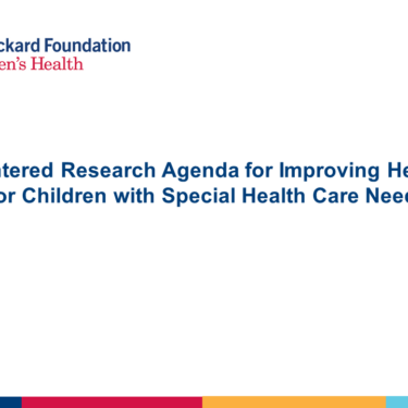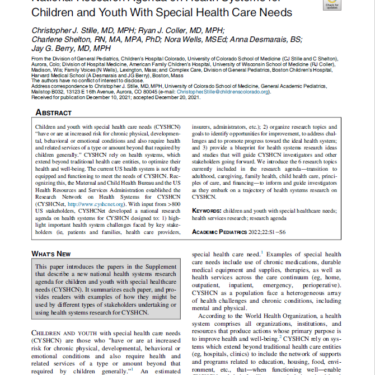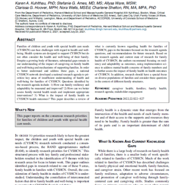 Researchers and family leaders from across the country partnered to develop a national research agenda focused on improving the health care system for children and youth with special health care needs. This webinar focuses on research priorities in caregiving for children with special health care needs.