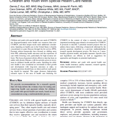 Children and youth with special health care needs (CYSHCN) are high utilizers of health care resources and their unique needs merit targeted consideration. The focus of payment reform efforts to date has been on adults with chronic illnesses, with less priority given to investment in children's health and the life course. Spending for children's health is an investment in their growth and development with long-term outcomes at stake. This paper discusses high-priority research topics in the area of health care financing for CYSHCN including what is currently known and important knowledge gaps.