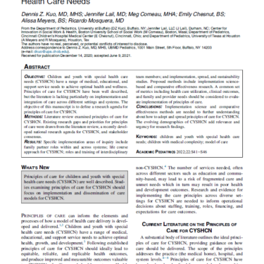 Children and youth with special health care needs (CYSHCN) have a range of medical, educational, and support service needs to achieve optimal health and wellness. Principles of care for CYSHCN have been well described, but the literature is lacking particularly on implementation and integration of care across different settings and systems. The authors identify four primary areas of investigation that could further understanding of how to adopt and spread principles of care for CYSHCN.