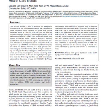 Social and environmental factors contribute to health inequities among children and youth with special health care needs (CYSHCN). While still an emerging field of research, authors stress the need for greater understanding of the patterns and impacts of social determinants of health as experienced by CYSHCN.