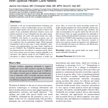 Telehealth has the potential to improve quality of care, particularly deficiencies related to access and patient experience of care. Telehealth may also reduce disparities for children and youth with special health care needs (CYSHCN) by alleviating barriers to accessing in-person care, for example, making it easier to access care for those residing in rural areas and children with medical complexity who are particularly fragile. Authors review the current knowledge around telehealth, identify populations for whom telehealth could be especially beneficial, discuss the important gaps identified, and make recommendations for specific studies that will help move the field forward.