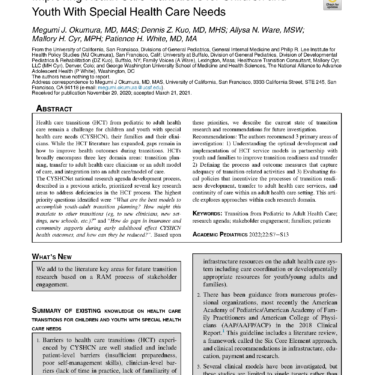 In this webinar, authors discuss their article titled Improving Health Care Transitions for Children and Youth with Special Health Care Needs. Speakers highlight the health care transition process for adolescents and young adults with special health care needs, describe study findings, and reflect on the implications of their recommendations.