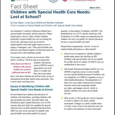 The findings from this study reflected data from a statewide school nurse advisory council, key informant interviews and a survey of nearly one thousand school nurses in California. Only 43% of California school districts report having school nurse personnel, and on average among those with a school nurse that individual had responsibility for six schools. Consequently, 1.2 million students had no access to a school nurse. Schools may often be unaware of children with chronic health problems unless those problems directly interfere with education and thus those children will have an IEP. In the absence of school nurses, other school staff members must assume health care responsibilities for which they are not only unlicensed/certified but also untrained. Schools generally lack established communications with community child health care providers who could provide some backup to staff. Some of the existing problems can be addressed by district supervisors or the State Department of Education; others may require legislative action.