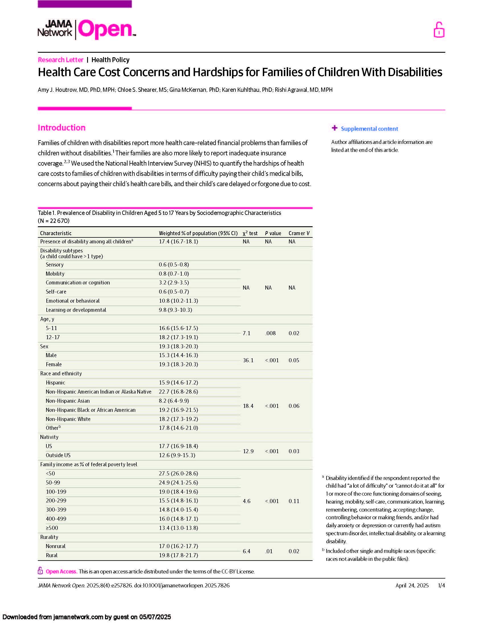 An article published in JAMA Network Open describes the findings of a study that looked at the health care cost concerns and challenges experienced by families of children with disabilities. The study used National Health Interview Survey (NHIS) data from 2019-2022 to quantify and analyze the hardships of families with regards to difficulty paying their child’s medical bills, concerns about paying their child’s health care bills, and the delaying or forgoing of their child’s care for financial reasons.