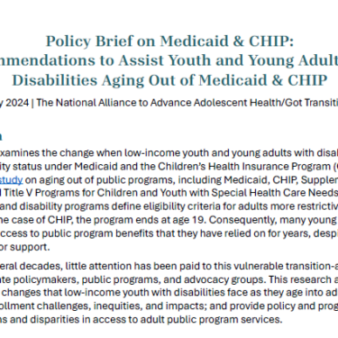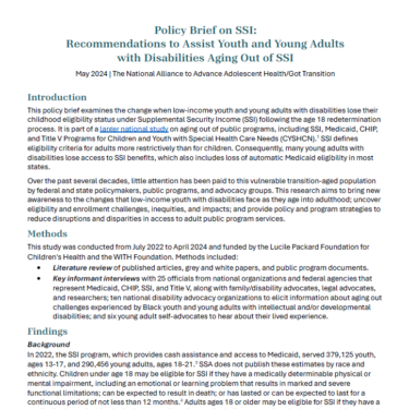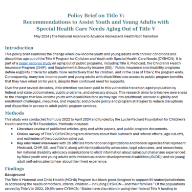 Переход от педиатрической к взрослой помощи является одним из самых сложных препятствий для молодёжи с особыми потребностями в области здравоохранения, однако этому процессу старения уделяется мало внимания в исследованиях, политике и правозащитной деятельности. В рамках данного проекта особое внимание будет уделено опыту и потребностям чернокожей молодёжи, у которой выше уровень инвалидности, она чаще живёт в бедности и вдвое чаще, чем их белые сверстники, не имеет медицинской страховки. В рамках проекта будут определены политика и стратегии, направленные на сокращение перебоев и неравенства в сфере ухода, а также будут предоставлены рекомендации по обеспечению и улучшению доступа к государственным льготам для взрослых, в частности, через четыре основных поставщика: Medicaid, Программу медицинского страхования детей, Дополнительный доход по социальному обеспечению и услуги, предусмотренные Разделом V.
