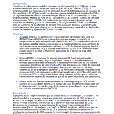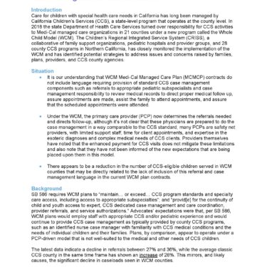 Недавно Департамент здравоохранения штата передал ответственность за деятельность Службы по защите детей Калифорнии организациям управляемого медицинского обслуживания Medi-Cal в 21 округе в рамках новой программы под названием «Модель целостного ребёнка» (WCM). Опираясь на предыдущий грант, данное финансирование позволит получателю гранта продолжить мониторинг реализации программы WCM, чтобы гарантировать, что дети будут получать высококачественную помощь, включая доступ к соответствующей педиатрической специализированной помощи, лекарственным препаратам, медицинскому оборудованию длительного пользования и вспомогательным услугам в рамках программ управляемого медицинского обслуживания.