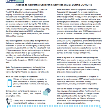Gumawa ang kawani ng NHeLP ng fact sheet, sa pakikipagtulungan ng Family Voices of California, sa pag-access sa pangangalaga sa panahon ng pandemya na kasalukuyang available sa English, Chinese, at Spanish. Nagbigay ang NHeLP ng detalyadong liham sa Department of Health Care Services (DHCS) na may mga rekomendasyon para sa binagong gabay sa patakaran tungkol sa pagiging karapat-dapat sa CCS, mga pagdinig ng estado, access sa matibay na kagamitang medikal, outreach ng pamilya at pangongolekta ng data. Pinagtibay ng DHCS ang marami sa mga rekomendasyong ito at naglabas ng na-update na patnubay para sa programa ng CCS pagkatapos masuri ang liham. Bukod pa rito, ang mga abugado ng kawani ng NHeLP ay nakipagtulungan sa DHCS at pinamamahalaang mga plano sa pangangalaga upang magsagawa ng outreach sa mga pamilya upang matiyak na naiintindihan nila ang patnubay.